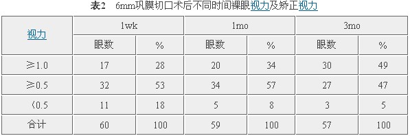 2.1.2 6mm巩膜切口60只眼,术后裸眼及矫正视力达1.0及以上者为49%,0.5以上者为95%.0.5以下术后1wk为11例,占18%,经治疗术后并发症及相关眼底病变术后3mo8只眼视力超过0.5,2只眼0.4,1只眼0.25,见表2。
