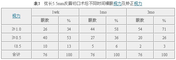 2.1.3 弦长5.5mm反眉状小切口76只眼,术后裸眼视力和矫正视力达1.0及其以上者占71%,0.5以上占97%,0.5以下由术后1wk10例(占13%)经对症治疗视力均回升0.5以上,仅2只眼分别是葡萄膜炎并发白内障,发育性白内障弱视0.3、0.12(见表3)。