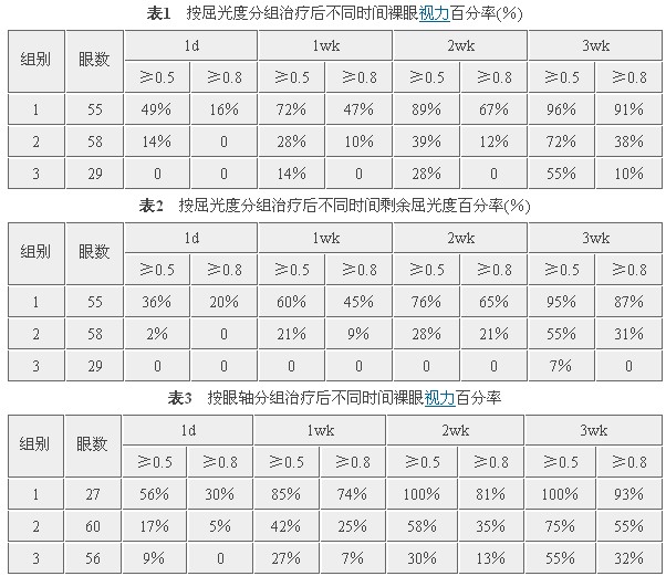 1.2 方法 以上病人均予行电脑验光、插片试镜、角膜曲率计检查、测角膜直径、眼压、眼底、裂隙灯检查及眼AB超检查。对有角膜上皮点状脱落、倒睫及高眼压者治疗至正常后方予配戴OK近视矫正镜片。每晚睡觉时戴10~12h,对睡眠不足10h者,临睡前或起床后连续戴镜。如白天戴镜则由于角膜的受力关系,效果较晚上差。连续戴3mo,并对以上病人分别进行自戴镜后1d、1wk、2wk、3wk及连续3mo的随访(因部分病人未达3mo故本文仅限3wk内患者的随访)。