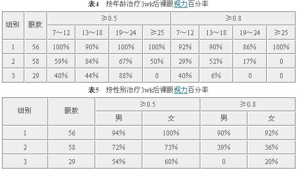 并发症及处理(1)重影:12例24眼在治疗过程中出现不同程度的视物重影,占所有病人的16%,全部为第3组病人(占73%),大部分病人继续戴镜1wk后症状消失,2例于继续戴镜2wk后消失,1例因出现严重视物重影,无法学习,只得暂时停戴;(2)角膜上皮点状脱落:90%的病人在戴镜后次晨复查都出现轻度的角膜上皮点状染色,嘱于白天、临睡戴OK镜前及晨起取下镜片时滴人工泪液,一般当天下午复查即可恢复,1wk后角膜荧光素染色全部转为阴性,未发现有严重角膜上皮脱落者;(3)角膜上皮条状擦伤:5例8眼在戴镜后1d出现角膜上皮条状擦伤,考虑为镜片边毛,或镜片未洗净,予镜片重新打光磨片并教会病人清洗镜片,一般均于d2角膜恢复正常,个别严重者停戴1~2d后也可恢复正常;(4)视力回退:第1、2组中有7例13眼,经OK近视矫正2wk后视力达0.8以上,但3wk后又出现视力回退,视力均降至0.5以下,甚至降至原来视力,其原因为部分学生学习紧张,用眼过度,且每晚戴镜时间少于8h所致;(5)过敏:仅在3组中发现1例过敏患者(〈1%)。患者每次于戴镜后即出现双眼痒,结膜充血,镜片取下后症状马上缓解,戴镜前予以抗过敏药物,不能阻止症状出现,故该病人目前暂时停戴。
