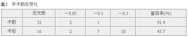 2.2 视力变化 手术前后视力变化见表2。手术前后盲目率比较有显著性差异(χ2=16.9697,P〈0.0001)。35眼中16眼视力无改变,其中弱视3眼,白内障或者瞳孔膜闭7眼,青光眼性视神经萎缩2眼,感染控制不良3眼,植片感染1眼。