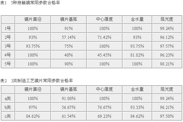 1998年10月至1999年2月,北京市同仁隐形眼镜中心在北京市技术监督局的协助下,利用软性接触镜尺寸分析仪,含水量测定仪,焦度计测定5种品牌接触镜的镜片直径、基弧、中心厚度、含水量及屈光度。将所测镜片按品牌和加工工艺分组进行检测,依据《GB1147.2-89软性亲水接触镜》所定标准计算出各自的质量合格率。