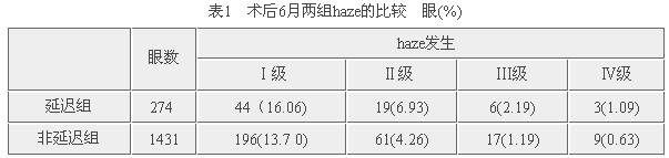 2.5 延迟组与非延迟组haze发生比较 延迟组haze的发生率为26.27% 、而非延迟组为19.78%,两组差异有显著性意义(χ2检验,P <0.05)。且各级别(见表1)比较差异亦有显著性意义(Ridit检验,P<0.05)。