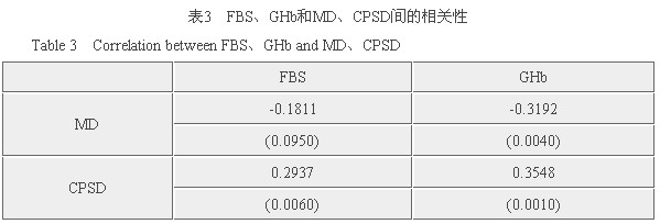 2.2.2 相关分析 将FBS、GHb与视野指标MD、CPSD作线性相关分析,见表3。