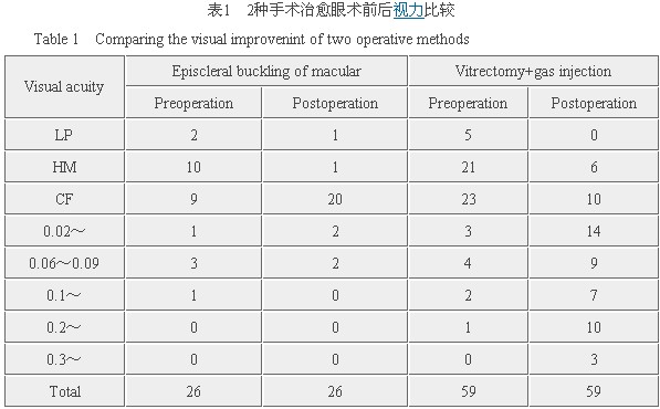经卡方检验,2种术式的治愈率比较,玻璃体切割注气术虽高于黄斑部加压术,但无显著性差异(P>0.05);2种术式的视力改善普遍性比较有显著差异(P<0.01),玻璃体切割注气术后视力改善明显;2种手术后视力维持不变情况比较有显著性差异(0.01<P<0.05),2种术后视力下降情况比较也有显著性差异(0.01<P<0.05),黄斑部加压术后视力减退及不变者明显居多。