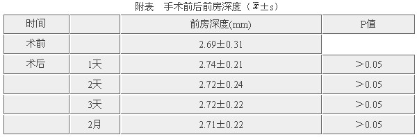 2.3 前房 57眼术后随访未见前房出血、瞳孔变形、虹膜损伤,晶状体无明显混浊。术后连续3天及2个月时前房深度与术前差异无显著性意义(配对t检验),无1例浅前房或前房延缓形成(见附表)。