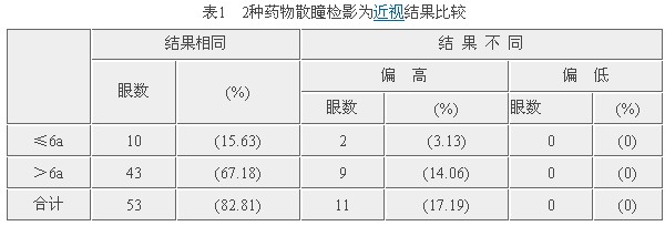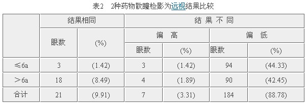 ≤6a组与>6a组相比,2种药物散瞳后结果相同率有显著性差异(χ2=10.11,P<0.01)。结果不同的191只眼中184只眼为结果偏低。