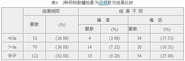 远视散光194只眼,≤6a组与>6a组相比,2种药物散瞳后结果相同率无显著性差异(χ2=1.88,P>0.05)。