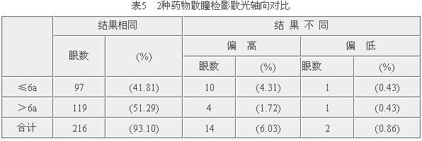 近视散光38只眼,≤6a组与>6a组相比,2种药物散瞳后结果相同率无差异(χ2=1.06,P>0.05)。
