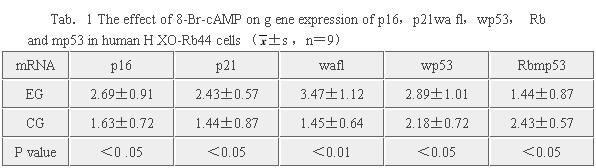 Antioncogene Rb plays a re gulatory role through phosphorylation an d dephosphorylation of cdks.The phosphor y lated PRb losses the inhibitory effect o n G1 phase,while the dephosphorylatedd PRb possesses the inhibitory function.Th e P16INK4 or P21wafl can combine w ith cdks,such as cdk2,cdk4 in competit ion with cyclins,hence cdks cannot be ac tivated by cyclins and Rb cannot be phos phorylated.The cell cycle check point is blocked by phosphorylated PRb[8].The carcinogenesis of human retinoblastoma may be caused by defect of Rb gene.In th e present experiment the 8-Br-cAMP could up-regulate the expression of Rb mRNA a nd PRb-IR.It suggests that 8-Br-cAMP may inhibit HXO-Rb44 cell growth through th e activation of Rb antioncogene.
