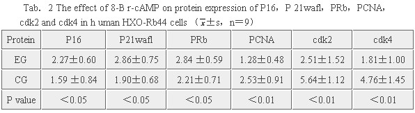 The immunost aining revealed that the dot blot immuno reactivity of P16,P21wafl and PRb protein expres-sion in human HXO-Rb44 ce lls were all stronger in EG than those i n CG,P<0.05,but the PCNA-IR,cdk2-IR a nd cdk4-IR were weaker in EG than those in CG,P<0.01.