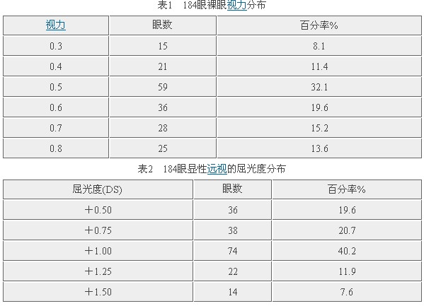结果:92例裸眼视力分布在0.3~0.8,其中0.5、0.6者占51.6%。视力在0.6以下者,均有明显的负性心理。显性远视的屈光度为+0.50D~+1.50D,其中+0.75D和+1.00D者占68.8%。