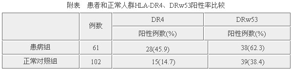 Vogt-小柳原田综合征患者中HLA-DR4阳性率45.9%,HLA-DRw53阳性率为62.3%,而正常对照组阳性率分别为14.7%和38.2%,患者与对照组相比差异有显著性意义(见附表)。