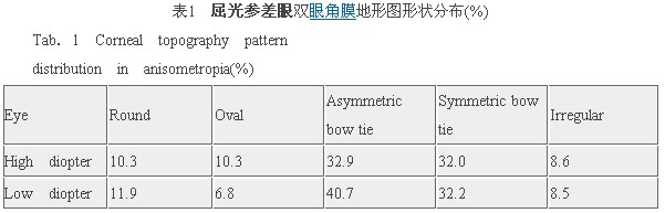 1.2 方法:双眼除做常规屈光检查外,用美国Alcon EH270角膜地形图仪检查双眼角膜地形图,每眼重复3次,由熟练技师操作,选取图质佳者为分析对象。另外从其余病例中随机选取非屈光参差近视者60名作为对照组。角膜地形图图形分类使用Bogan等[2]的分类方法将其分为5类。
