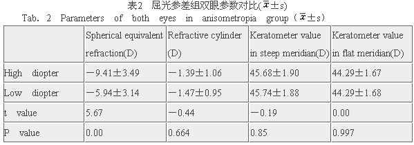 2.2 屈光参差眼高度数眼与低度数眼近视度数、散光度数、角膜地形图陡峭轴角膜屈光力(keratometer value of steep meridina,Ks)、平坦轴角膜屈光力(keratometer value of flat meridina,Kf)比较见表2。除双眼近视度数不一致外,散光度数及Ks、Kf双眼无差异(P>0.05)。