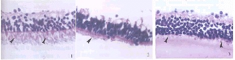 图1 改良的准分子激光切削法获取的感光细胞组织片,箭头示完好的内外节段(HE×400) 图2 酶分层消化法获取的感光细胞组织片,箭头示较好的外节段(HE×400) 图3 常规明胶粘固的视网膜经激光切削后的感光细胞组织片,箭头示受损的外节段(HE×400) Fig.1 Photoreceptor sheets ablated by modified excimer laser surgery arrows indicate photoreceptors with perfect inner and outer segment(HE×400) Fig.2 Photoreceptor sheets obtained by enzyme gradation digestion arrows indicate photoreceptors with good inner and outer segment(HE×400) Fig.3 Photoreceptor sheets ablated by regular excimer laser surgery arrows indicate photoreceptors with impaired inner and outer segment(HE×400)