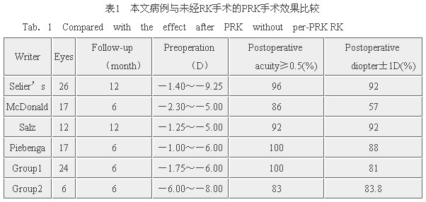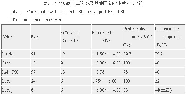 PRK治疗RK术后的残余近视是安全有效的。本文30例中2例经过2次RK手术,又接受PRK治疗,术后裸眼视力分别为0.9与1.2,较二次RK术后明显提高。我院随访结果与国外文献报道结果相似,证明PRK手术效果稳定、可预测性强(见表1)。与其他国家RK术后的PRK相比以及与RK二次术后相比(见表2)可以看出,我们的结果与美国的Durrie及韩国的Hahn结果十分相似,均明显优于二次RK手术[3~7]。