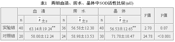 1.3.1 SOD用黄嘌呤氧化酶法测定其活力高低:①取新鲜血清、房水、晶体匀浆液各0.003ml;②充分混匀置37℃恒温箱中水浴40分钟;③与2ml显色剂混匀,10分钟后倒入1cm光径比色杯中,蒸馏水调零;④波长550nm处比色计算SOD值。
