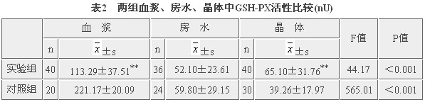 2.2 GSH-PX在血浆、房水、晶体中活性变化如表2所示。