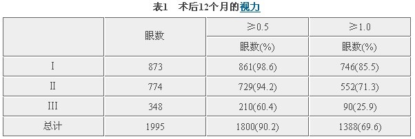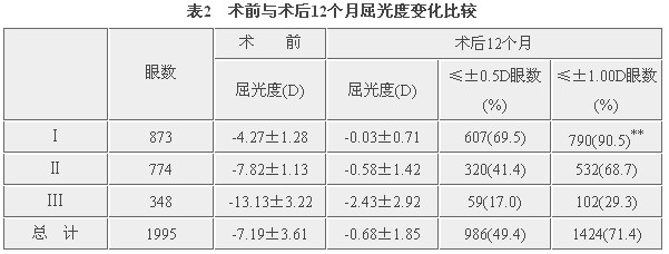1.1 一般资料 本组病例共1995眼,其中男1101眼,女894眼,年龄18岁~59岁(26.9±6.86岁),术前裸眼视力0.01~0.6(0.11±0.07),最佳矫正视力0.4~1.5(1.22±0.27),术前球镜屈光度-0.75~-15.50D(-7.19±3.61D),柱镜屈光度0~-5.50D(-0.72±0.77D)。按球镜屈光度分组,Ⅰ组≤-6.00D(-4.27±1.28D),873眼;Ⅱ组-6.25~-10.00D(-7.82±1.13D),774眼;Ⅲ组>-10.00D(13.13±3.22D),348眼。随访时间12个月。本组病例除外青光眼,活动性角膜病变,圆锥角膜,结缔组织疾病等。