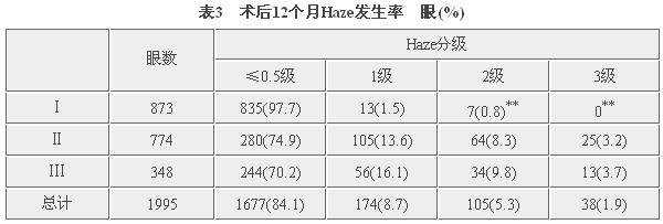 术后随访日期:第3、10天和1、2、3、6、12个月,复查内容包括术前检查的全部项目及自觉症状和Haze等。Haze分级根据Fantes[6]分级法分为5级:0级:无混浊;0.5级:轻微混浊,1级:轻度混浊,2级:中度混浊,3级:严重混浊。