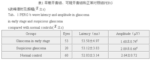 2.1 PERG:可疑开青组与正常对照组比较,PERG振幅有高度显著性差异(P<0.01);早期开青与对照组比较,PERG振幅有高度显著性差异(P<0.01)。各组间峰潜时无显著性差异(表1)。