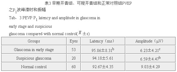 bP<0.05,cP<0.01 vs normal control2.3 PVEP:早期开青组与正常对照组比较,P1波峰潜时有显著性差异(P<0.05);P1波振幅有高度显著性差异(P<0.01)。可疑开青组与对照组比较,P1波振幅有显著性差异(P<0.05)(表3)。