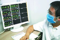 7月13日晚,一名医护人员正在监视获救矿工生命体征。新华社发