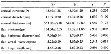 表l 两组患者角膜曲率、直径、厚度以及角膜瓣的横径、纵径、蒂长 度的比较(i±J) Tab.1 The comparison of corneal eurvature,diameter,thickness and flap thickness,diameter anti hinge length in the two groups(,i+s)