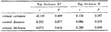 表2两组角膜瓣厚度与角膜曲率、直径以及角膜厚度的相关性分析 Tab.2 Correlation analyses between flap thickness and anterior seg. menl data in the Zyoptix XP and Ilansatome group