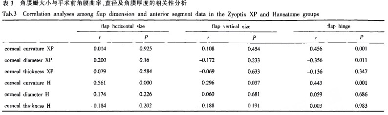 2.4 两种板层刀制作的角膜瓣大小与手术前角膜曲率、直径及角膜厚度的相关性分析见表3。结果 显示,Zyoptix XP板层刀制作的角膜瓣横径、纵径与手术前角膜曲率、直径及角膜厚度均无相关性(尸>0.05),角膜瓣蒂长度与角膜曲率和直径有相关性(尸>0.05),与角膜厚度无相关性(尸>0。05)。Hansatome板层刀制作的角膜瓣大小与角膜曲率呈正相关(P>O.05)。与角膜直径和角膜厚度无相关性(P>0.05)。