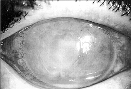 图2 例3,自动板层角膜成形术后的9个月,左眼裂隙灯检查显示水肿的角膜有一个肿胀浸润的角膜帽