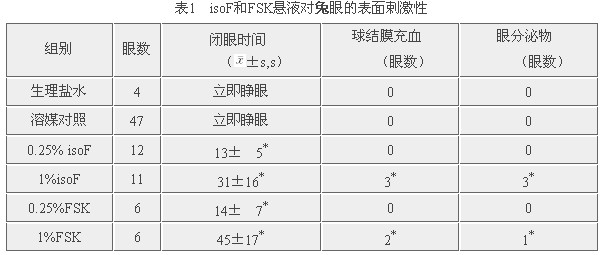 3.isoF和FSK对眼的剌激性:由表1部分浓度的记录结果可见,0.25%isoF和 fSK基本无剌激, 而1%浓度则有轻度剌激反应。裂隙灯下未见角膜或前房的改变。
