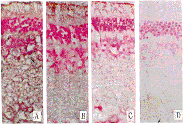 光镜下观察对照组大鼠视网膜具有正常的组织学结构。同时正常大鼠视网膜各层组织均有SOD mRNA的表达,彼此间强度无明显差异。而且无论在视网膜的各区域,其信号的标记部位及强度是一致的。