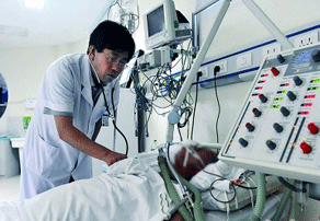 26日,千佛山医院病房,一位等待心脏移植的病人正在接受检查。
