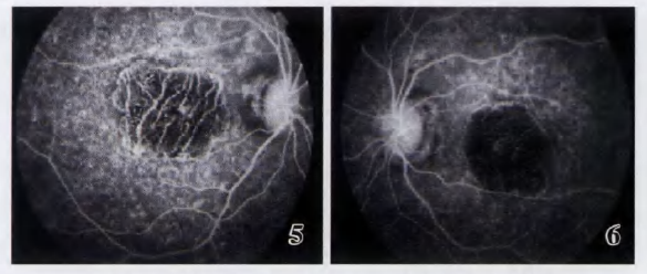 图5 右眼F F A 动脉期可见黄斑区脉络膜毛细血管萎缩及脉络膜大血管暴露图6 左眼F F A 静脉期可见黄斑区靶形窗样缺损及病灶内色素沉着