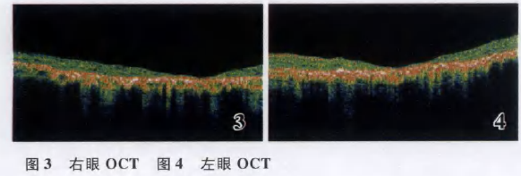 患者,男, 3 9 岁, 2 0 0 9 年1 月2 0 13 因自幼双眼视物不清, 视力下降1个月余来我院就诊。全身检查未见异常。眼科检查:视力右眼0.1 , 左眼0 . 0 6 , 双眼前节无明显异常, 眼底可见双眼色淡,边界清楚, 双眼黄斑区可见一直径约3 P D 大小的称性、椭圆对形、边界明显的萎缩灶, 其内部毛细血管萎缩( 图l ,2)。诊断:双眼中心性晕轮状视网膜脉络膜萎缩。眼底O C T检查:双眼黄斑中心凹加深, 中心凹处视网膜色素上皮( R P E ) /脉络膜层暴露、增厚、增宽, 反光增强, 形态不规则。提示R P E /脉络膜图样萎缩, 中心凹旁视网膜变薄( 图3 , 4 ) 。荧光素眼底血管造影( F F A ) 显示, 动脉期左眼动脉充盈, 黄斑区可见脉络膜毛细血管萎缩、消失, 暴露脉络膜大血管;静脉期左眼静脉充盈,可见靶形窗样透见荧光, 病灶内可见色素沉着;晚期随背景荧光消退,双眼黄斑部呈现不均匀透见荧光, 视盘呈相对高荧光(图5,6)。