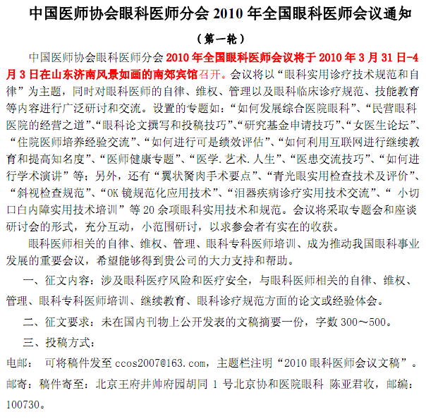中国医师协会眼科医师分会2010年全国眼科医师会议征文通知