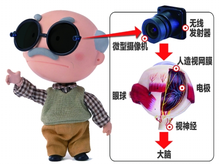 重大专家指出,按现在的技术,人工眼睛所使用的微型摄像机,还必须固定在眼镜上。但在不久的将来,如果研制出一种只有豌豆大小的微型摄像机,就可将微型摄像机移植到患者的眼球角膜下,从而取代人眼内感受外部图像的天然组织,让盲人不必戴眼镜。
