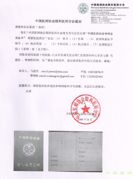 中国医师协会眼科分会办理会员证书通知