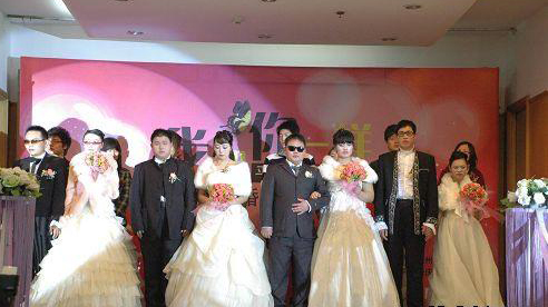 昨日上午十点整,在徐州市彭城广场,四对视力残疾人在现场来宾的祝福下喜结连理,许多市民见证了这一过程。