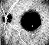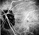 [病例1] 高度近视的黄斑变性。图1a是近视眼的FFA图像,注意在黄斑区有脉络 膜新生血管(CNV),它特别容易发生在高度近视的玻璃膜漆裂当中,ICGA早期明显(图1b) ,ICGA晚期(图1c )CNV仍有持续性强荧光。