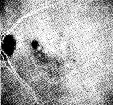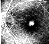 [病例4] 老年性黄斑变性。图4a 激光治疗以前的ICGA图像,中央为CNV的滋养血管; 图4b为激光治疗后一个月的ICGA图像,与治疗前比较,CNV明显萎缩。这是由于HRA的快速 摄像功能,能够在造影早期捕捉到CNV的滋养血管,使部分老年性黄斑变性患者能够 接受眼底激光治疗。