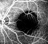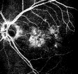 [病例2] 老年性黄斑变性伴有色素上皮脱 离,并有轻度的白内障。图2a,是该病例的早期FFA图像,由于合并白内障,眼底血管的境 界比较模糊,后极部可见大片的低荧光区(黑色区域)系色素上皮脱离区,看不见任何CNV ;图2b,是同一病例的 ICGA图像,与图2a比较,血管境界明显清晰,色 素上皮的脱离区也显示为低荧光区,其中的一个强荧光点就是CNV。两者比较可见,在伴有 色素上皮脱离的情况下,ICGA更能够显示CNV。 [病例3] 老年性黄斑变性。图3a是F FA 图像,为境界不清楚的晚期强荧光,不能分辨CNV,而在ICGA图 像(图3b)上CNV非常清楚,该例属于隐匿性的CNV。