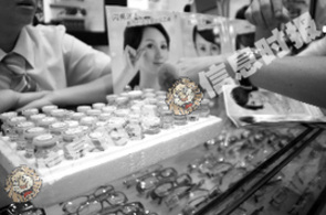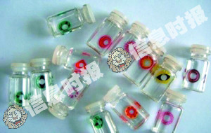 记者看到,这些“山寨美瞳”都装在小玻璃瓶里由液体浸泡着。“颜色越夸张价钱就越贵,像这个鲜红色款的,至少要140元。”格子铺店主向记者推荐了一个“GEO”牌的有色隐形眼镜,并说那是纯韩国进口,其水凝系列的价格只要50元/对。
