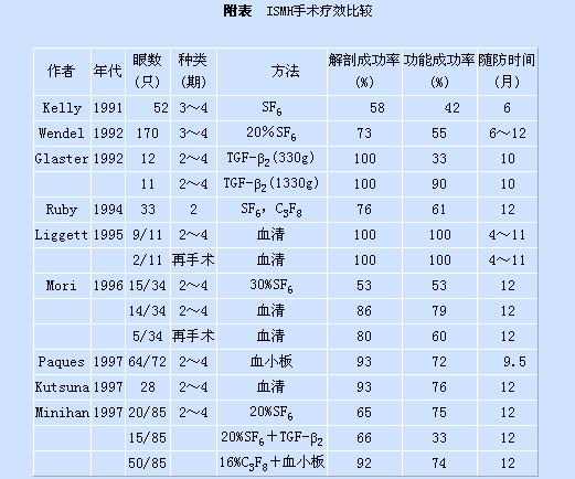 由于部分病人术后进行性晶体核硬化的存在,PAM(potential acuity meter)被认为是术后测量视力较为准确的方法。Freeman等[1]报道对3、4期ISMH手术治疗结果,术后随访12个月,解剖成功率为60%,PAM测量视功能提高程度,手术组与观察组相比差异显著P<0.01。Kim等[17]治疗的2期ISMH组,术后随访12个月,解剖成功率80%,PAM测量与观察组相比差异极显著P<0.002。