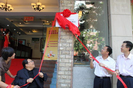中残联副主席吕世明(左一)和亚组委志愿者部部长、团市委书记王焕清(右二)为亚运城市志愿服务祝安盲人按摩共建点揭牌