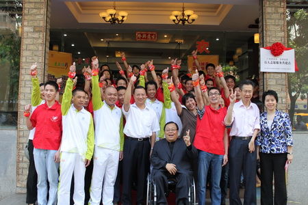 10月24日上午,在结束了慰问亚残运会志愿者骨干之后,中残联副主席、亚残运会组委会副主席吕世明一行,在亚组委志愿者部部长、团市委书记王焕清,广州市残联理事长梁左宜,亚组委志愿者部副部长林燕芬等领导的陪同下,出席了在滨江东路祝安盲人按摩院举行的“广州市亚运会、亚残运会盲人志愿服务共建点”揭牌仪式。