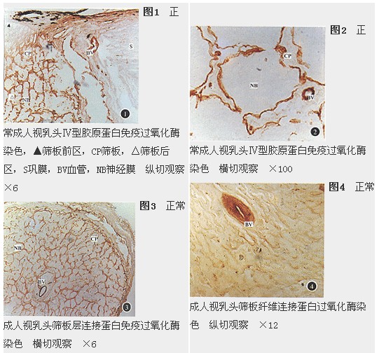 1.人Ⅳ型胶原蛋白免疫过氧化酶染色:正常视乳头筛板存在大量Ⅳ型胶原蛋白(图1,2)。纵切标本显示Ⅳ型胶原蛋白在筛板区呈板状、横向分布构成筛板的主体。横切面观察,IV型胶原蛋白形成一完好连续薄膜包绕筛板,高倍镜下观察在筛板核心存在细丝样阳性染色。神经束中无阳性染色。在视乳头筛板前区,只有血管处有阳性染色。在筛板后区,阳性染色物衬覆神经束,血管壁也存在阳性染色。视乳头中血管内皮基底膜作为Ⅳ型胶原蛋白阳性对照。巩膜部除血管外,无Ⅳ型胶原蛋白着染。
