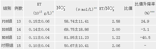 近几年的体外和动物实验证明,高血糖状态下内皮细胞源性收缩与舒张血管的活性物质生成失恒可造成微血管损伤和调节异常。目前认为一氧化氮(nitric oxide, NO)和内皮素(endothelin, ET)是一对重要的局部舒缩血管活性物质。我们检测了Ⅱ型糖尿病患者外周血中ET和亚硝酸盐(nitrire,